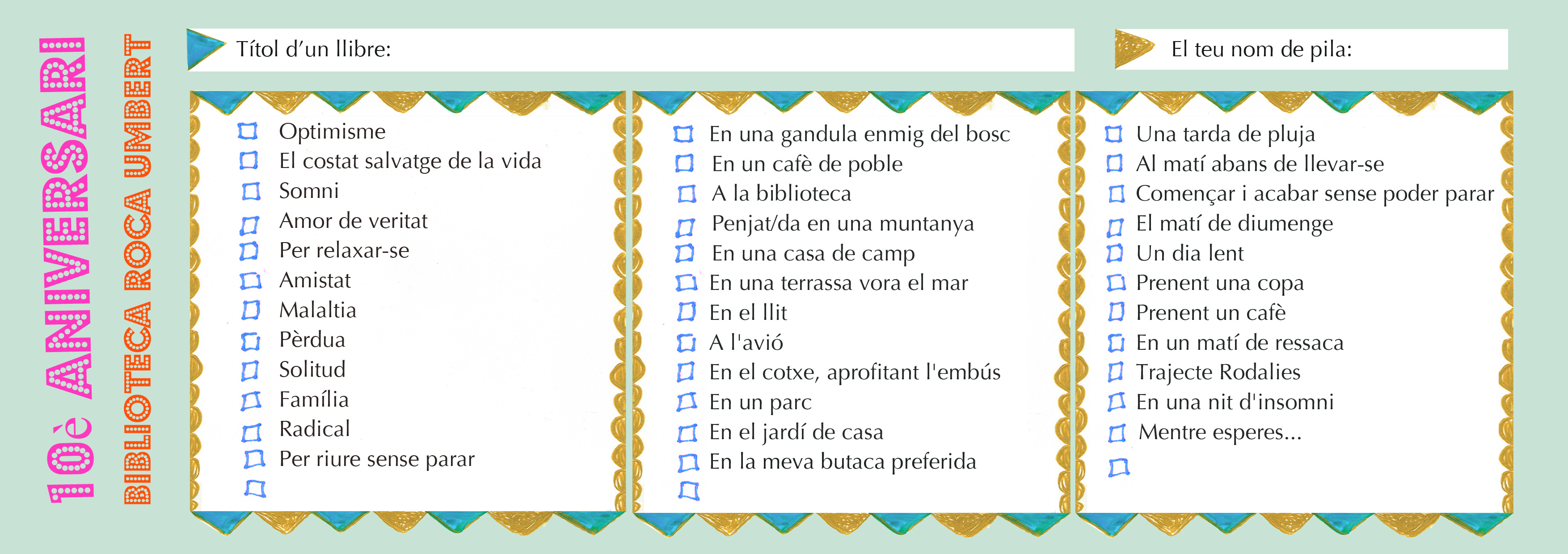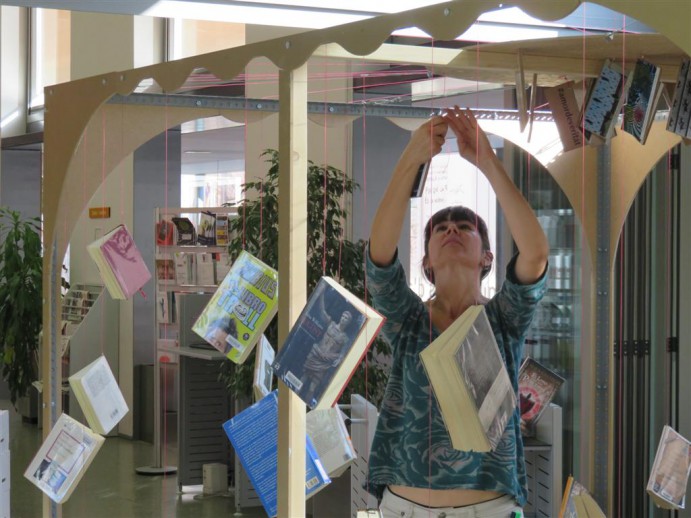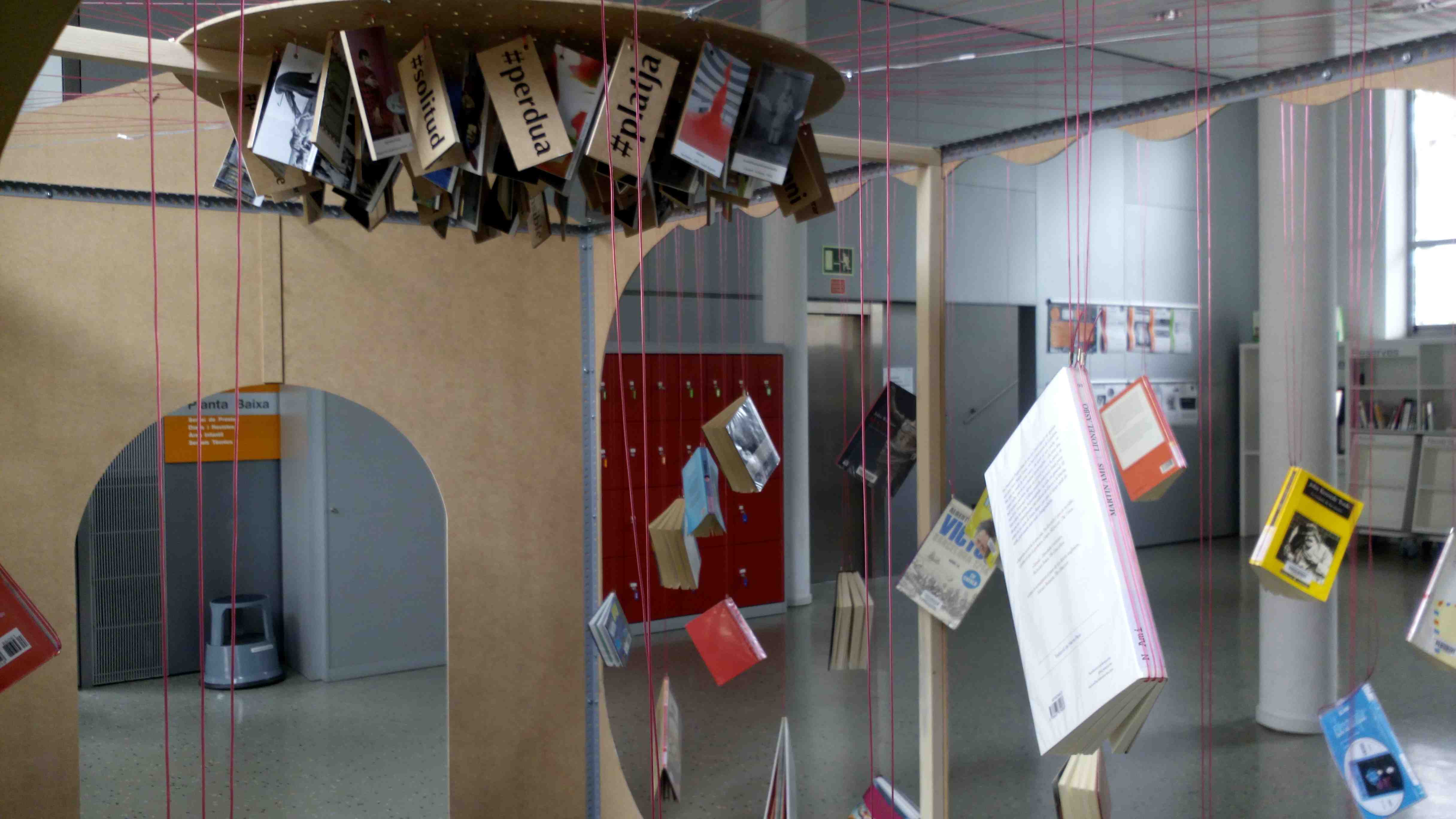 D’aquesta manera, cada llibre està unit, mitjançant un o més cables, amb diferents etiquetes amb temes com #solitud, #enelllit, #prenentuncafe…És en estirar alguna de les etiquetes que pugen el llibres associats a aquesta.Aquest és un projecte que em van convidar a pensar, i a realitzar, per tal de celebrar el 10è aniversari, i que, juntament amb el personal de la biblioteca, i l’aportació dels lectors, s’ha anat contruint durant els últims mesos.
