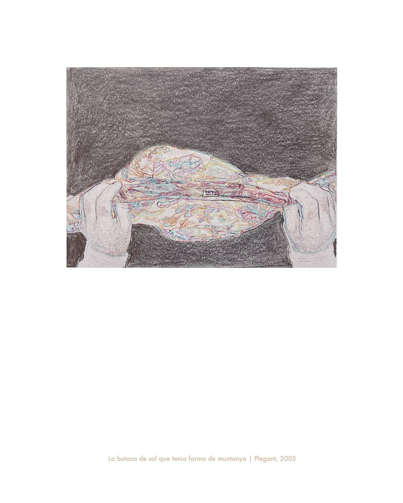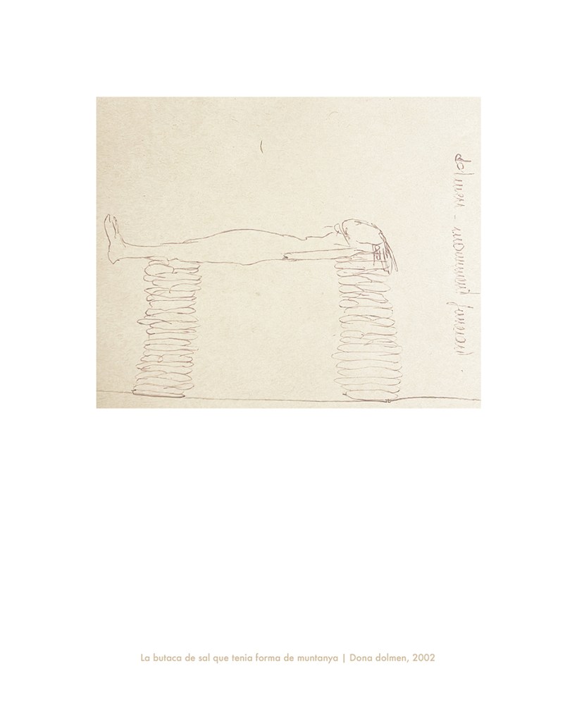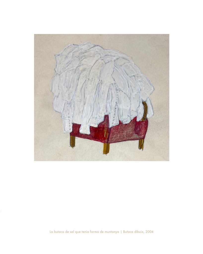“La butaca de sal que tenia forma de muntanya” és un projecte d’investigació artística que reflexiona sobre la relació entre la natura, el treball domèstic i les cures, utilitzant la sal gemma com a material. La proposta analitza com aquests conceptes es connecten simbòlicament i socialment, i planteja la creació d’una escultura de sal, extreta de pedra de la mina de Cardona, en forma de butaca plena de roba per plegar, instal·lada en un camp de pastura de Farrera (Pallars Sobirà), on hi ha el CAN Centre d’Art i Natura.